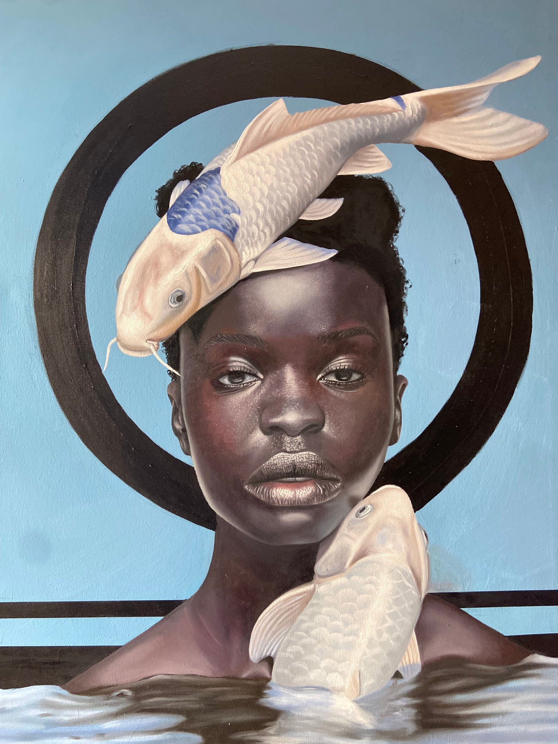 Segun Caezar is a Nigerian-born, Toronto-based visual artist known for his striking oil portraits of Black subjects, often infused with surreal and symbolic elements. With over a decade in figurative realism, his recent work features koi fish as ancestral spirits and silent witnesses to time.