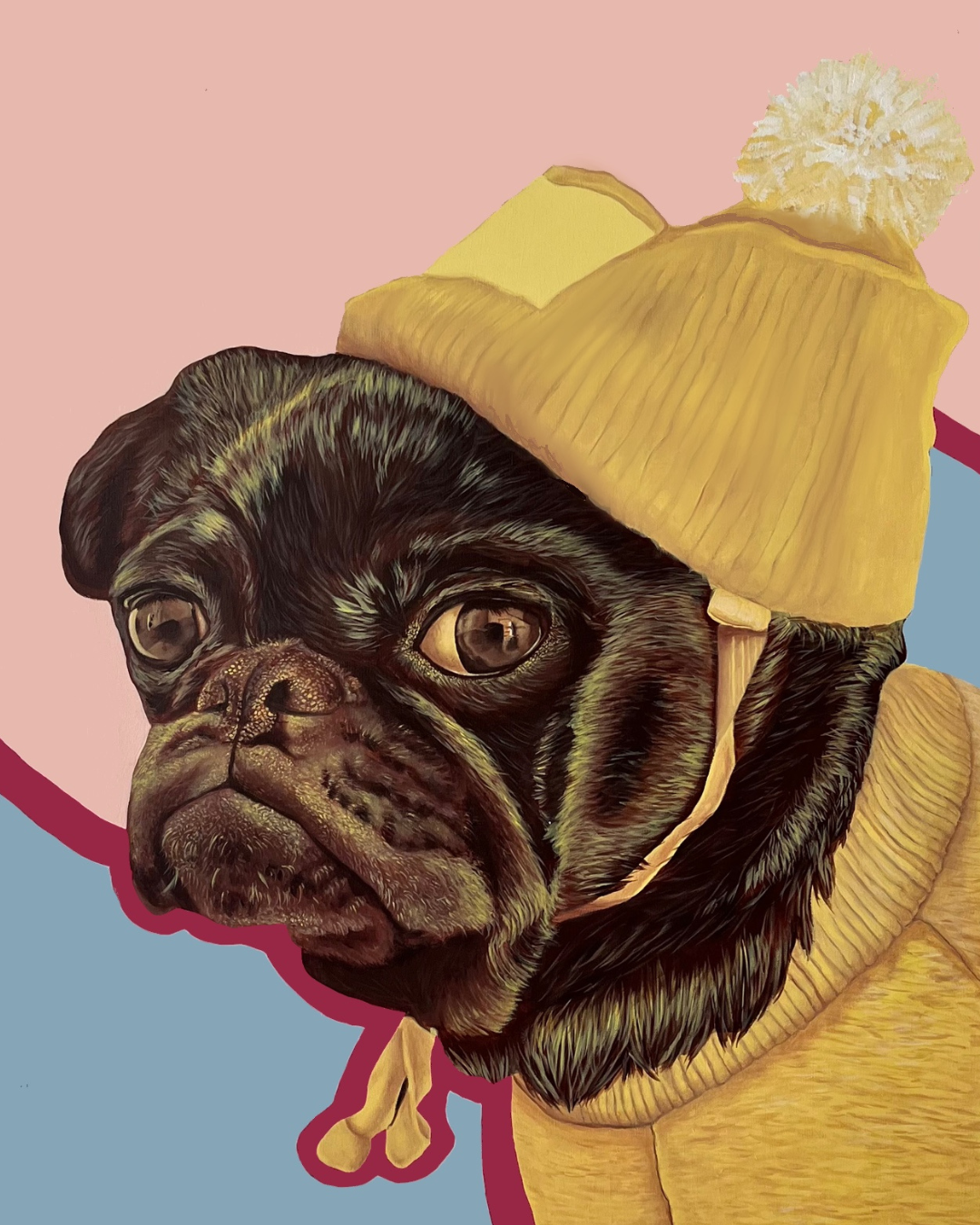 Thrifted Velvet Couch reflects on how we project emotion, vulnerability, and identity onto our pets by humanizing them through clothing and expression. Balancing humour and tenderness, the work uses playful kitsch to comment on the absurd charm of treating animals as reflections of ourselves.