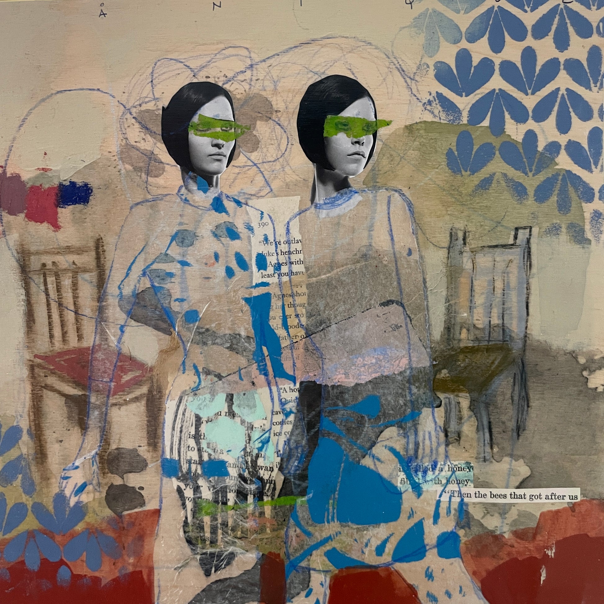 This is one of Janique’s pieces that brings together her signature mix of collage, painting, and layered texture. Combining vintage imagery, bold colour, and detailed patterning, it reflects her ongoing exploration of form, identity, and storytelling through mixed media.