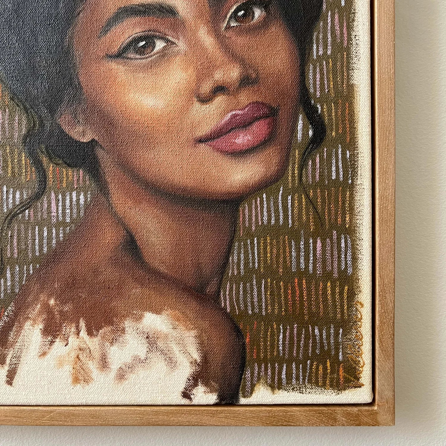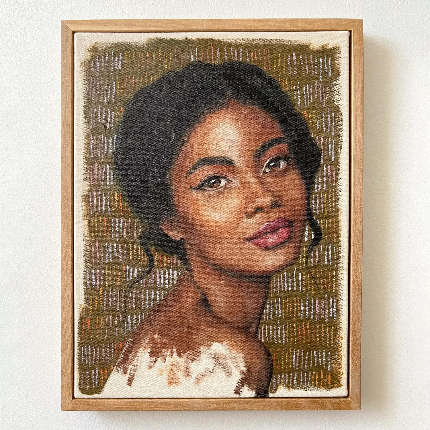 Each piece in this series is part of an intimate collection of 12x16” oil-on-canvas portraits celebrating feminine diversity and inner power. Painted with expressive brushwork and refined detail, these works are a tribute to multicultural beauty, self-acceptance, and the richness of human experience. Custom framed in solid Cherrywood, they’re created with both new and seasoned collectors in mind — offering connection, reflection, and a moment of stillness in our ever-moving world.