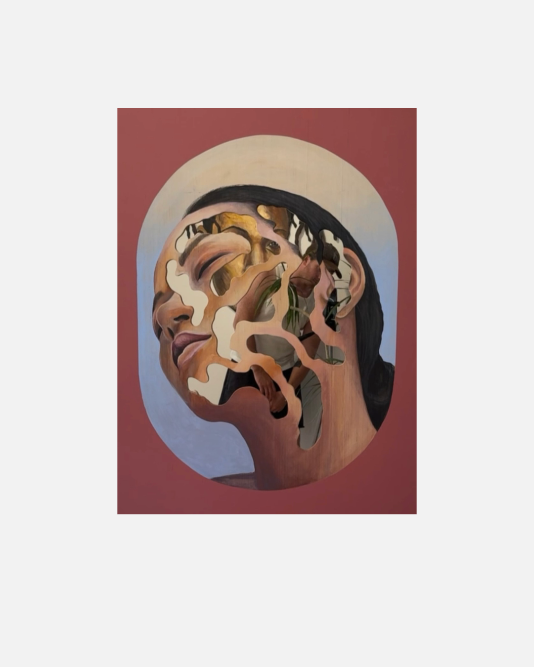 This piece continues Nick Bodoin’s exploration of memory and perception. Through sculptural cut-outs and a mirrored backdrop, he blurs the line between portrait and reflection, inviting viewers to see themselves within the work. Soft tones and intricate layers create a quiet space for presence, introspection, and connection.