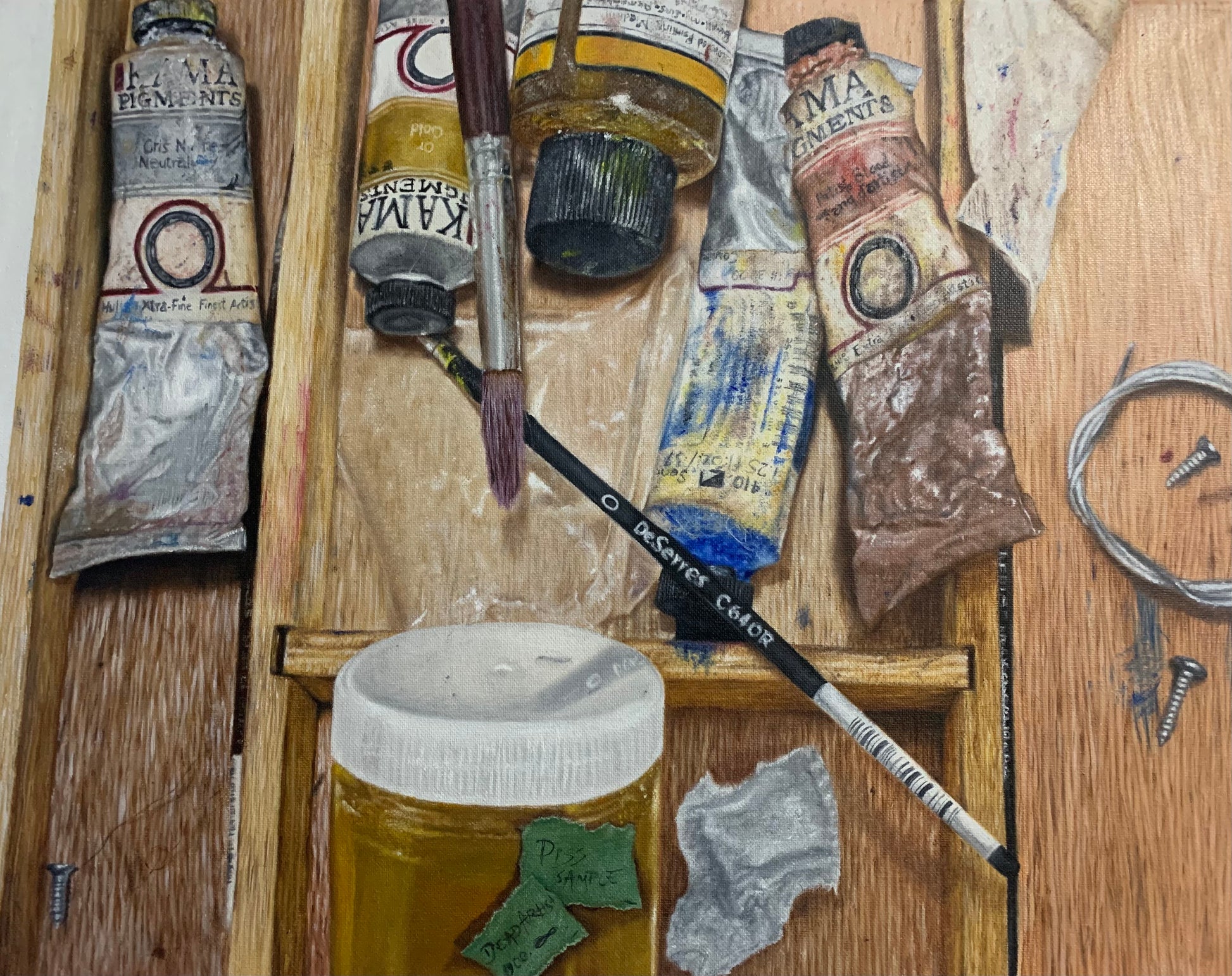 Candid shot of the artist's portable painting easel displaying some form of disorder while glorifying its contents of both the tools within and the carrier itself.