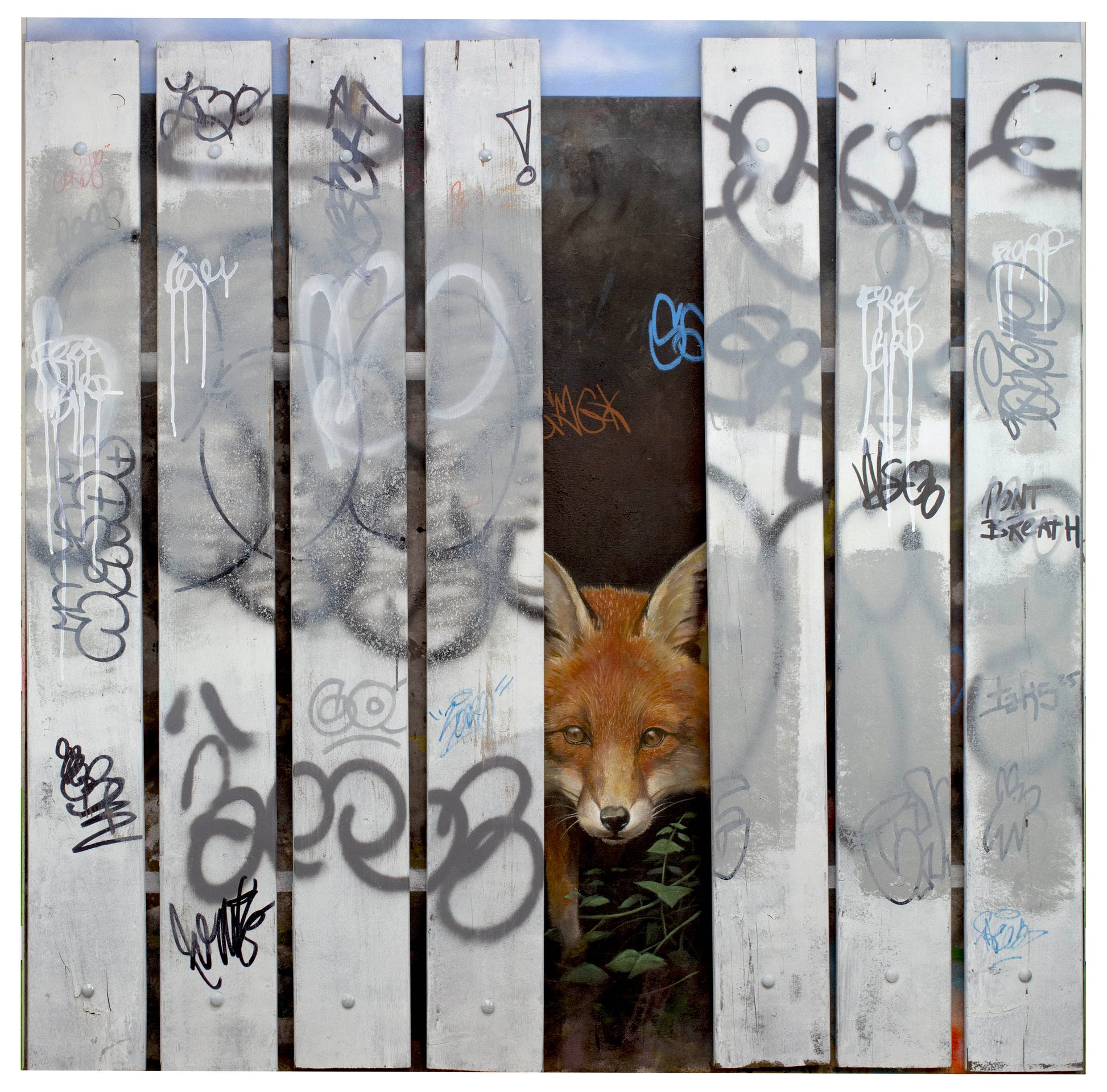 Peering through the slats of a weathered, painted fence, a fox meets our gaze. There’s a calm persistence in its look, a reminder of how nature holds its ground even in the middle of human marks and boundaries.