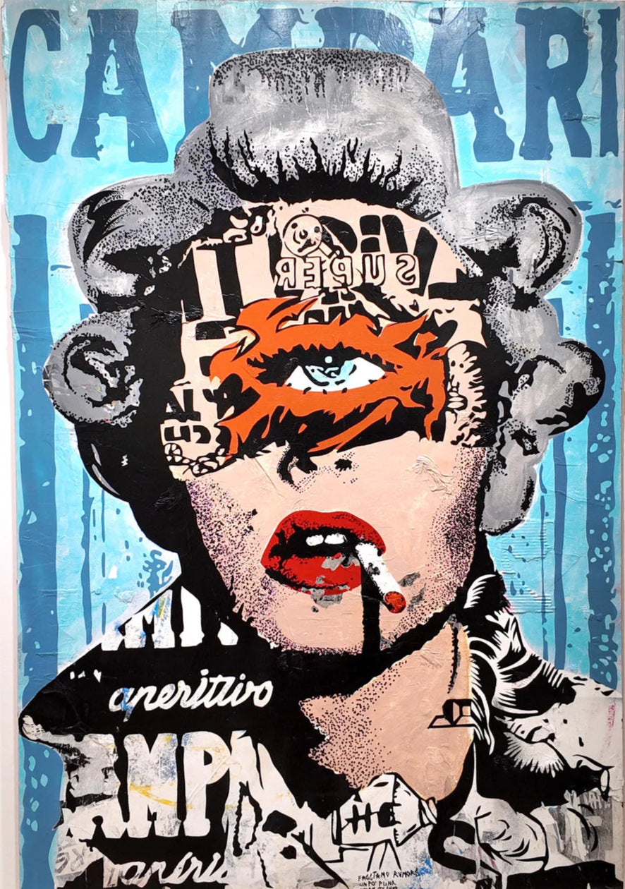 In Marlon, Teetz layers bold typography, vintage imagery, and gritty textures into a striking portrait. With its vivid blues, fiery reds, and masked gaze, the piece channels both pop culture and rebellion—capturing the raw, chaotic beauty at the heart of his work.