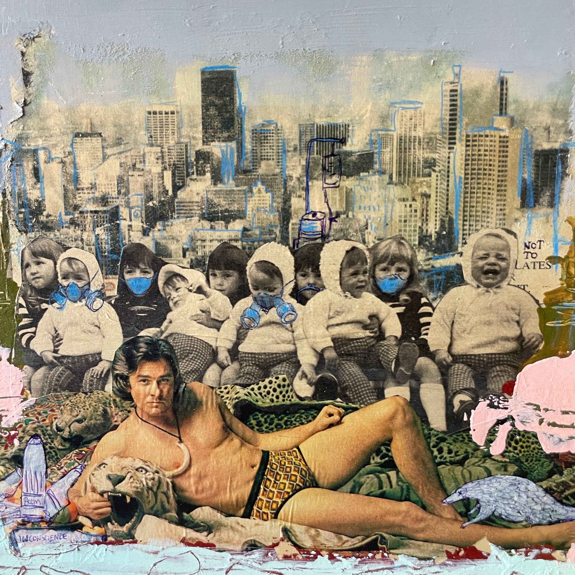 This is one of Janique’s pieces that brings together her signature mix of collage, painting, and layered texture. Combining vintage imagery, bold colour, and detailed patterning, it reflects her ongoing exploration of form, identity, and storytelling through mixed media.