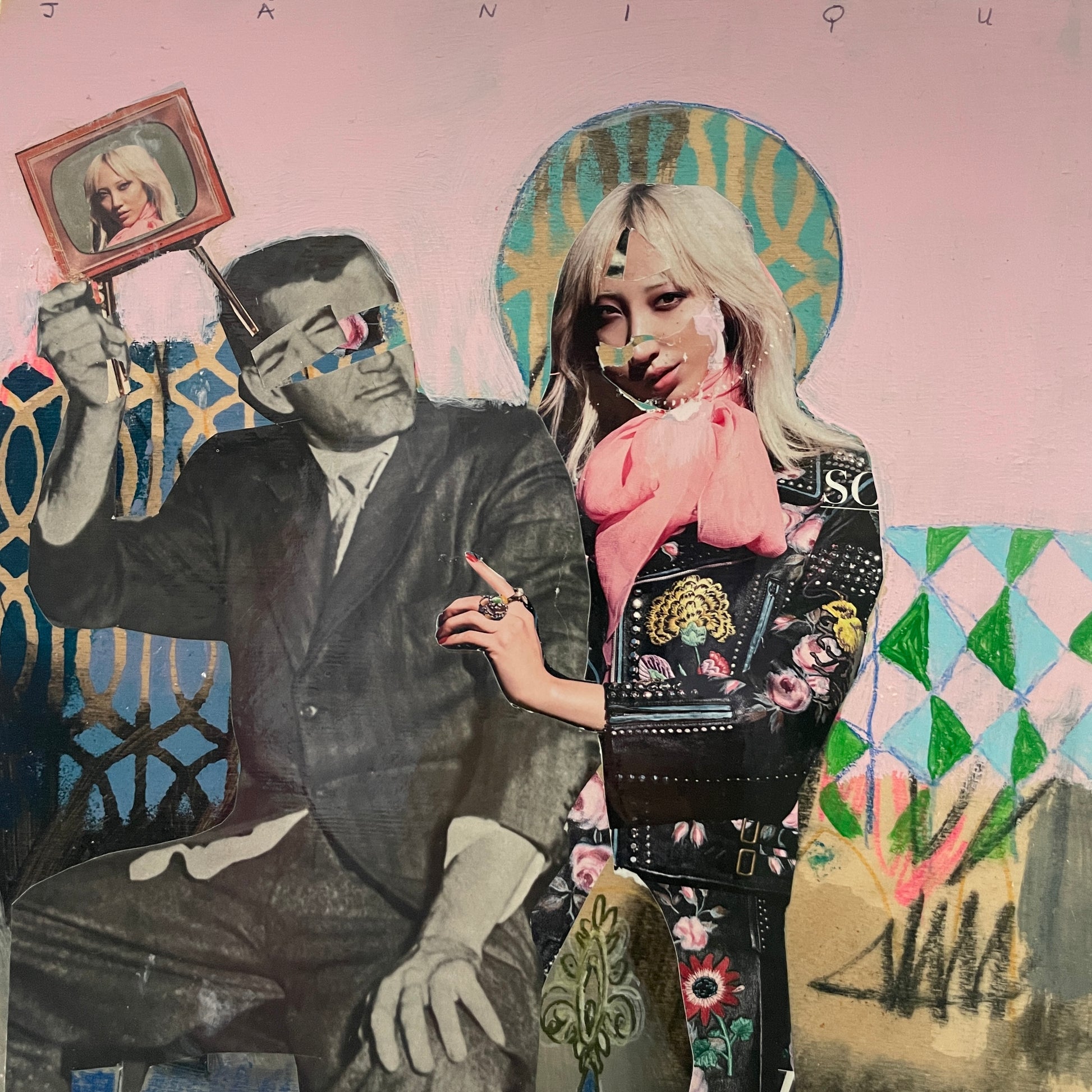 This is one of Janique’s pieces that brings together her signature mix of collage, painting, and layered texture. Combining vintage imagery, bold colour, and detailed patterning, it reflects her ongoing exploration of form, identity, and storytelling through mixed media.