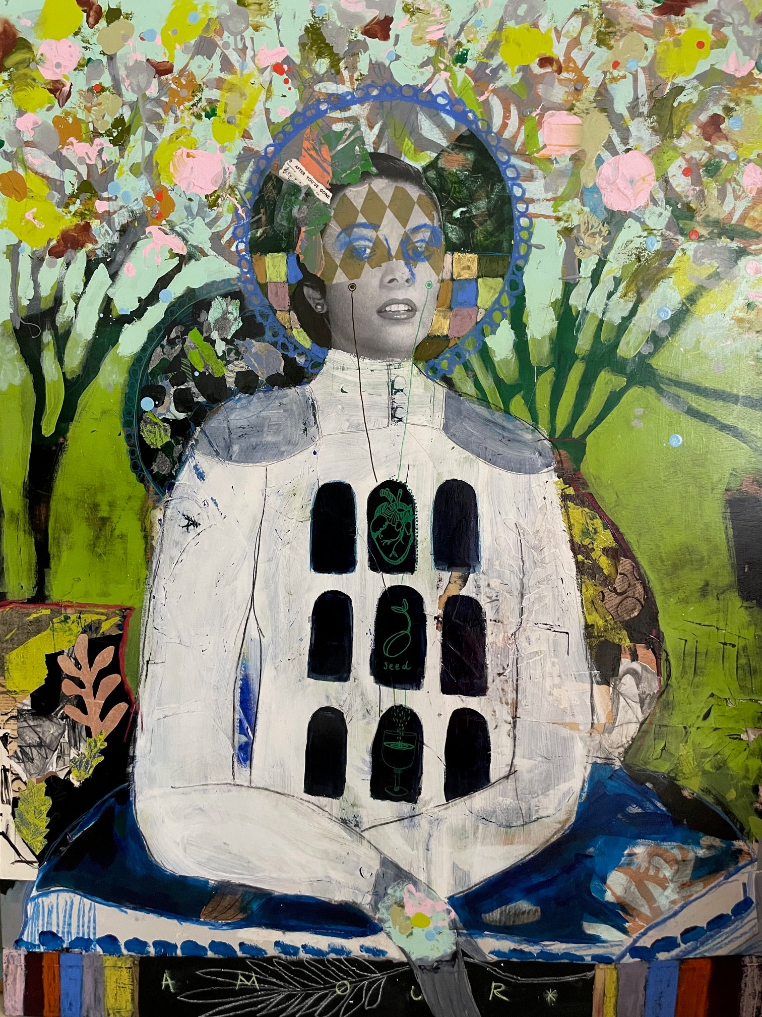 In Soul Journey, Janique weaves together painted texture, symbolic collage, and vintage portraiture to create a serene yet layered composition. The central figure—framed by blooming trees and surrounded by subtle symbols—becomes a vessel for growth, memory, and transformation. Like much of Janique’s work, the piece invites quiet reflection and emotional depth beneath its vivid surface.