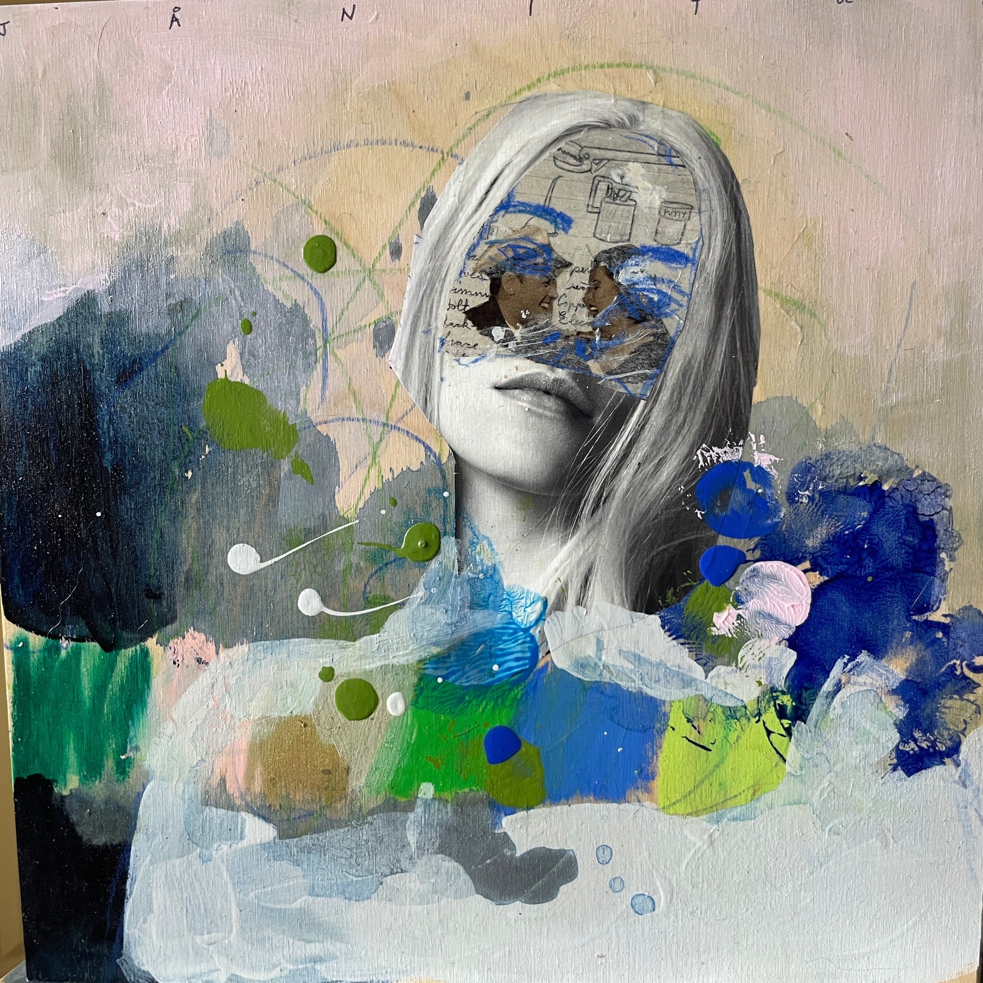 This is one of Janique’s pieces that brings together her signature mix of collage, painting, and layered texture. Combining vintage imagery, bold colour, and detailed patterning, it reflects her ongoing exploration of form, identity, and storytelling through mixed media.